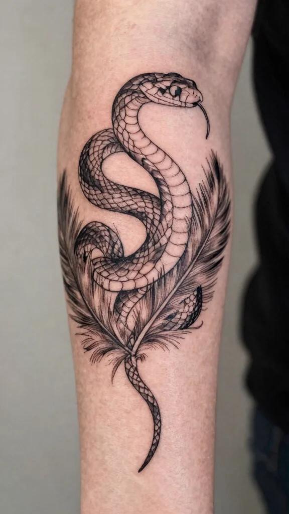 Create a unique tattoo with the fusion of a snake and feather, representing both freedom and transformation. This design combines the grounded essence of the snake with the airy lightness of feathers, making it artistically compelling.