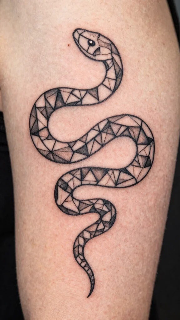 Transform traditional snake imagery with a modern geometric twist. This design combines clean lines and sharp angles to create a striking visual that appeals to art lovers. It’s perfect for anyone wanting an edgy yet refined tattoo.