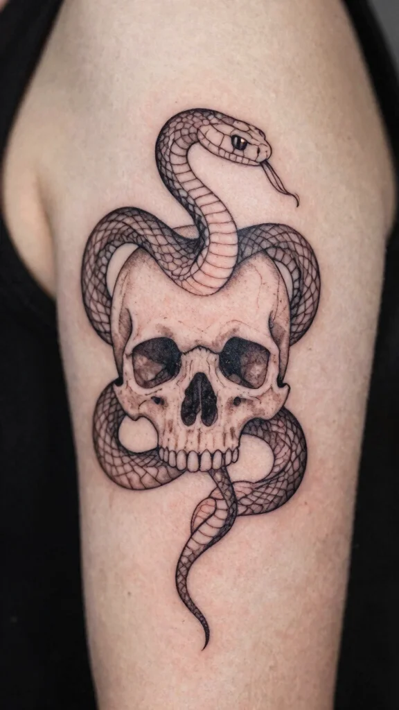 Merge life and death themes with a striking snake skull design. This concept, featuring a snake coiling around a skull, is both minimalist and powerful. It symbolizes transformation and the cycle of life, appealing to those who appreciate profound meanings in their tattoos.