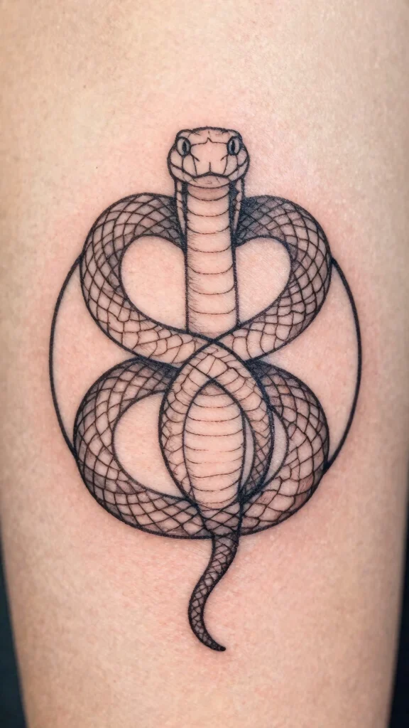 Create a striking tattoo with a serpent emblem that merges curves and geometric elements. This design typically features a snake curled with its tail in its mouth, symbolizing eternity. It’s not just a tattoo; it’s a meaningful emblem full of significance.