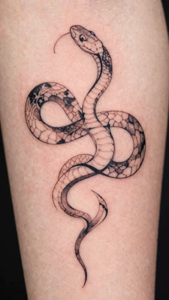 The infinity snake design combines the elegance of a snake with the symbolism of eternal love. This minimalist tattoo is powerful yet subtle, making it ideal for those wanting meaningful art without overwhelming detail. The smooth infinity lines blend beautifully with the snake’s form.