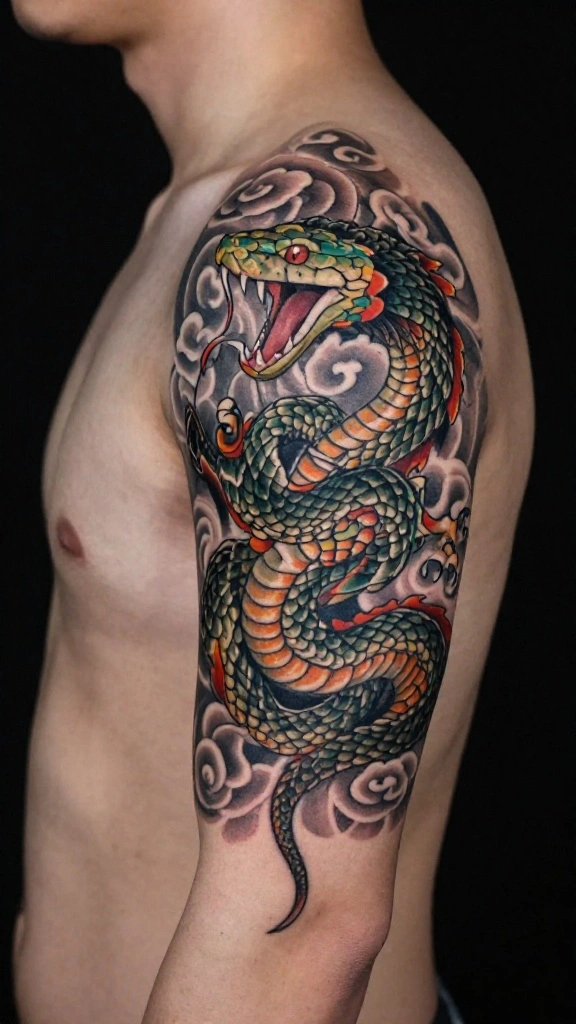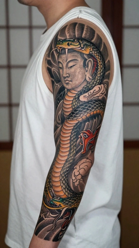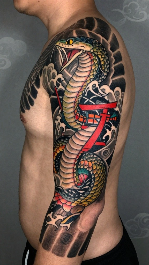 In Japanese tradition, snakes are often viewed as protectors. A guardian snake tattoo symbolizes strength, resilience, and the protective spirit guiding you through life’s challenges. This design can take many forms, frequently depicted coiled around sacred objects or alongside protective deities.Incorporating colors and traditional motifs like waves or clouds can enhance the tattoo’s symbolic meaning. For many, the guardian snake acts as a personal talisman, a reminder that they are never alone in their journey. This design resonates with those who value guidance and protection in their lives.Consider these design ideas:
