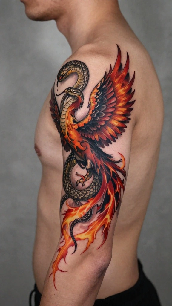 The combination of a snake and a phoenix in a tattoo symbolizes rebirth and transformation. The phoenix stands for resurrection, while the snake signifies change, making this design a profound symbol of personal growth.Often featuring vibrant colors and dynamic movements, this tattoo illustrates the intersection of these two powerful symbols. The narrative of a snake shedding its skin alongside a phoenix rising from the ashes beautifully emphasizes the cycle of transformation. This design is perfect for those who appreciate life’s cyclical nature.Here are some artistic ideas: