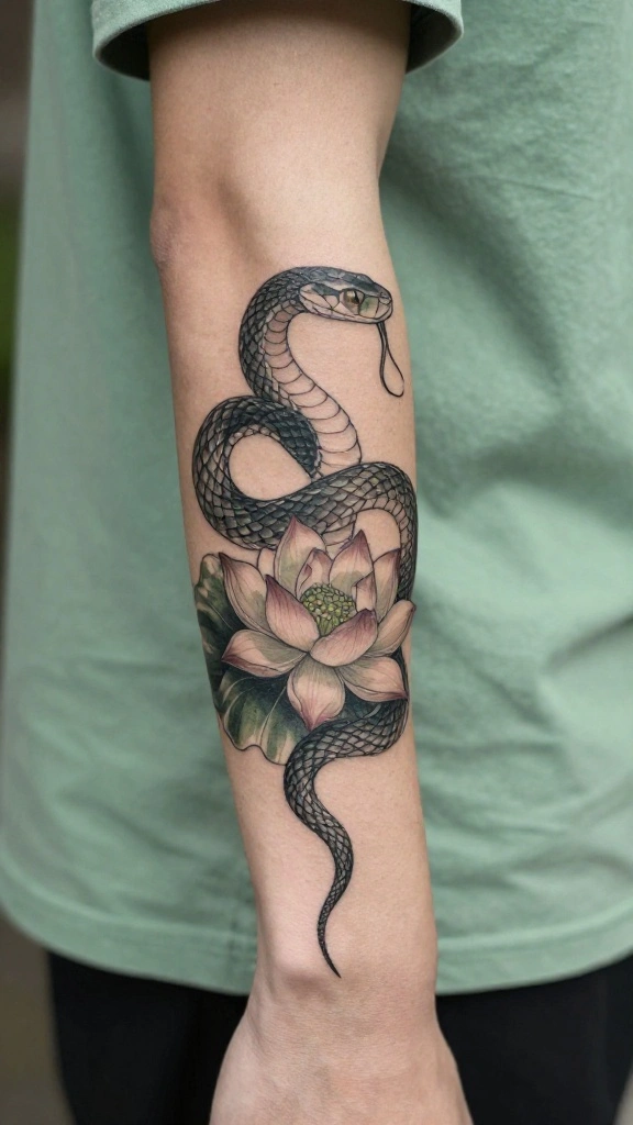 The combination of a snake and a lotus is a beautiful representation of life’s contrasts, embodying chaos and beauty. The snake symbolizes transformation, while the lotus stands for purity and rebirth, making this tattoo rich in meaning.This design offers a balance that resonates with those who appreciate life’s journey, filled with both struggles and victories. The intricate details of the snake’s scales against the delicate lotus petals create a visually stunning effect. It often features soft hues and flowing lines, resulting in an elegant and meaningful tattoo.Here are some artistic tips: