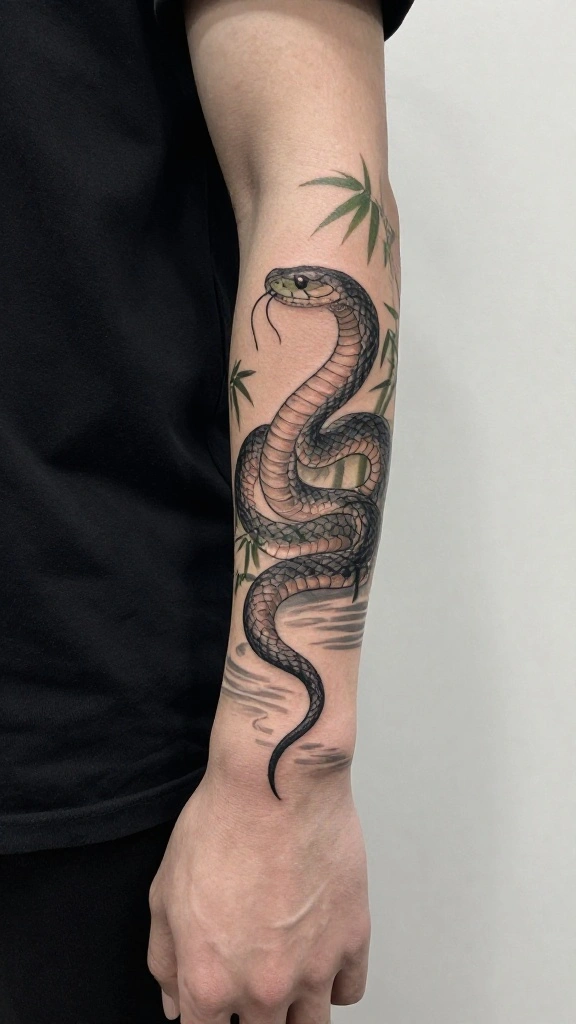 In Japanese culture, snakes are often linked with wisdom and knowledge. A tattoo of a snake in a serene pose symbolizes the pursuit of wisdom and the importance of introspection. This design typically incorporates calming elements like bamboo or water, crafting a peaceful narrative.Opting for this design communicates your value of learning and growth, emphasizing your journey toward enlightenment. The snake’s calm presence against tranquil nature enhances the message of seeking knowledge through peace. This tattoo suits those prioritizing wisdom in their lives.Here are some design tips: