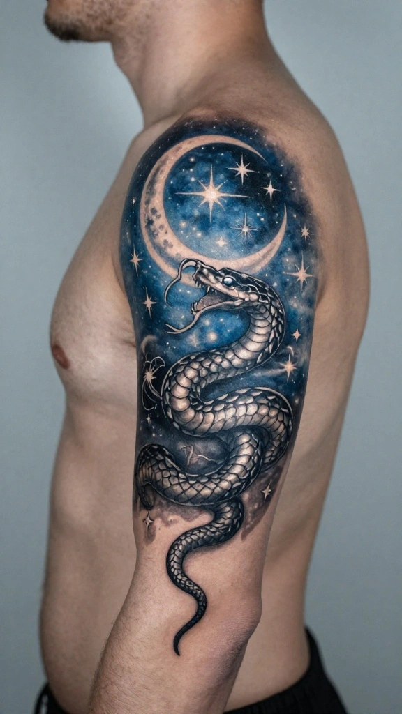 In various cultures, the moon symbolizes mystery and transformation. A tattoo featuring a snake with lunar elements adds depth, representing change and the cycles of life. This design evokes a sense of wonder and introspection as the snake intertwines with the moon or stars.Often, this design showcases rich colors and shadowing techniques to create a celestial feel, connecting the earthly with the cosmic. It resonates with those who embrace life’s ebb and flow, celebrating the beauty of change. This tattoo serves as a powerful reminder of personal growth and life’s ever-changing nature.Here are some artistic considerations: