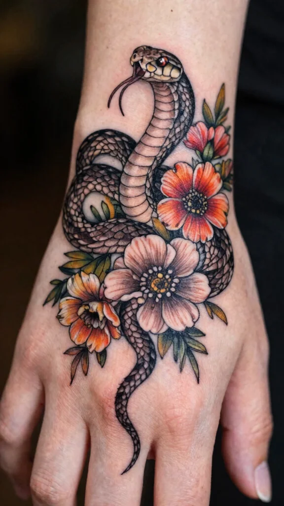 The integration of these elements not only enhances the visual appeal but also tells a compelling story of growth and renewal. Consider using vivid colors for the flowers against a softer snake color to create striking contrast.