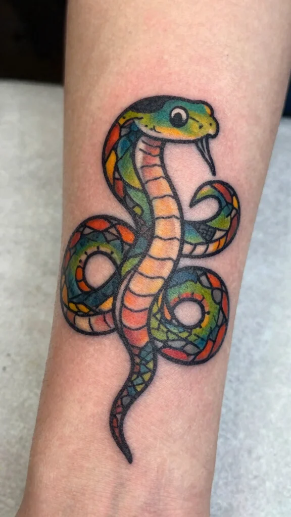 If you desire a playful tattoo, the whimsical snake design is an excellent choice. This design adds a cartoonish charm to the snake, complete with delightful features like a smiling face or a curled-up position. It’s perfect for those wanting to express their fun side while retaining a meaningful symbol.