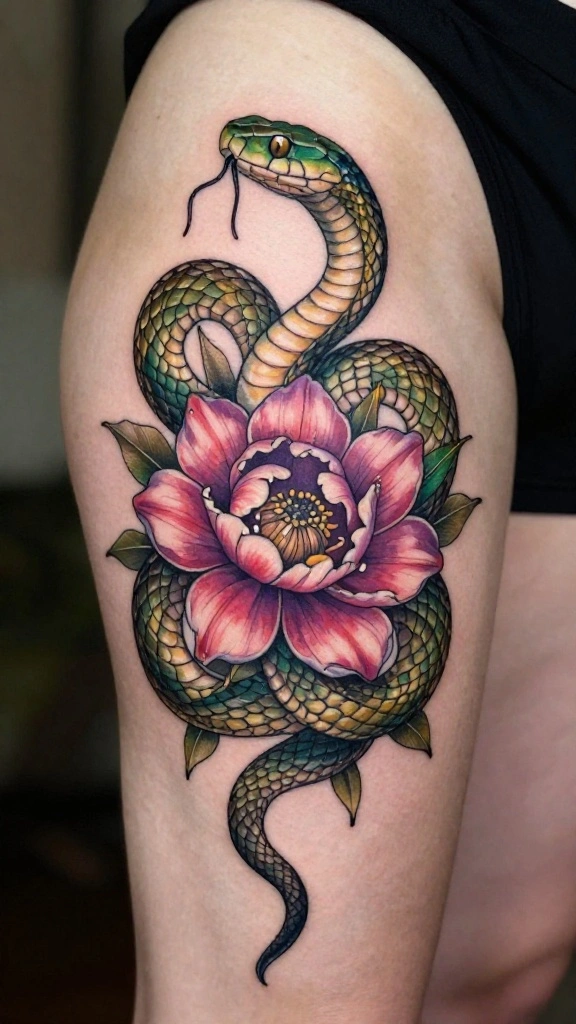 Imagine a coiled snake gracefully wrapping around a blooming flower, merging fierce energy with delicate beauty. The intricate scales, shimmering in shades of green and gold, contrast beautifully with the vibrant hues of deep pinks and purples in the petals. This tattoo not only captures attention but also symbolizes transformation and new beginnings, appealing to anyone looking to embrace their inner strength and femininity.