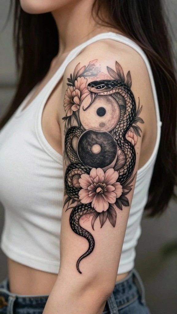 Imagine a tattoo that encapsulates balance, where a snake wraps elegantly around the yin yang symbol, surrounded by beautiful flowers. This design conveys harmony between opposing forces, illustrating life’s dualities and the resilience embodied by the snake.