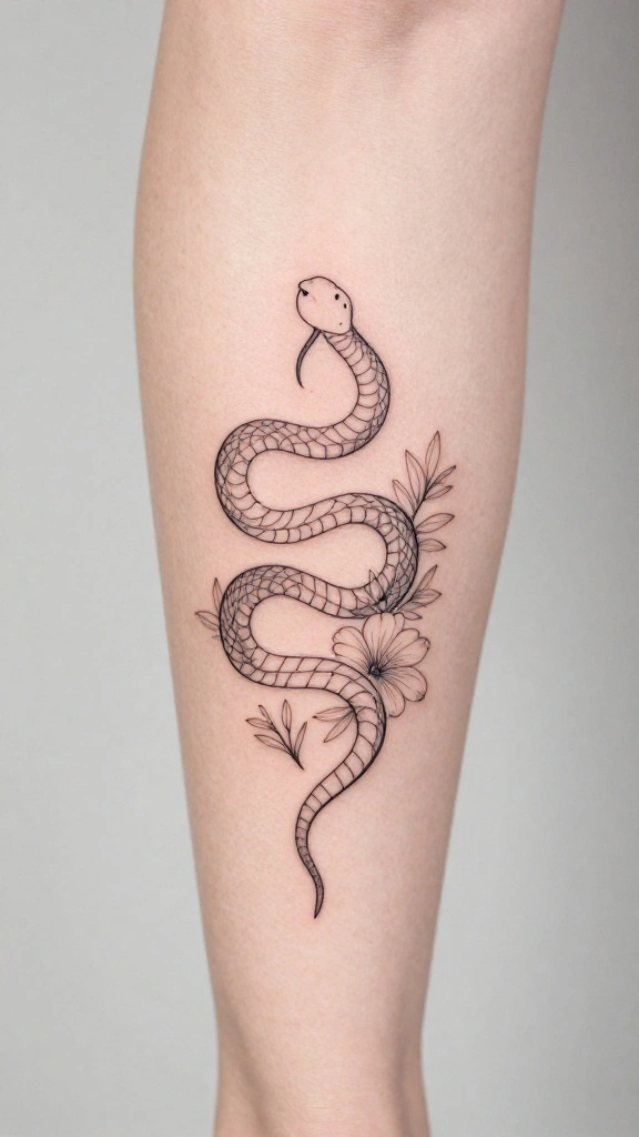 Consider a sleek Modern Minimalist snake tattoo that emphasizes simplicity and style, featuring a clean snake outline paired with minimal floral accents. This design captures elegance without overwhelming detail, perfect for those who appreciate a contemporary aesthetic.