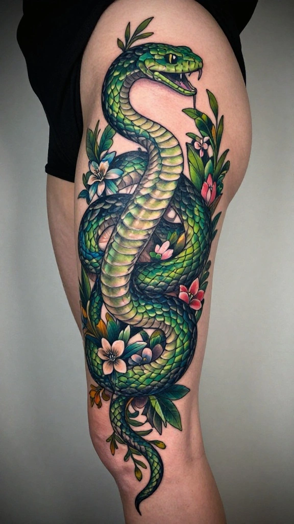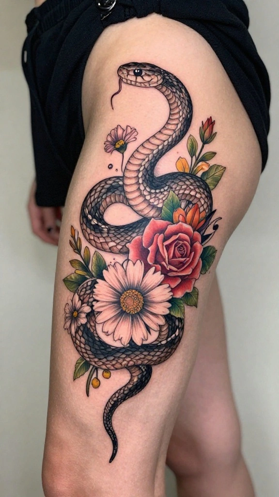 What do snake thigh tattoos symbolize, and how do floral elements change their meaning?