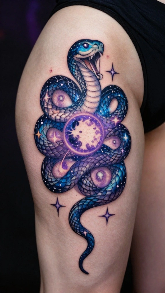 To enhance the celestial theme, metallic ink can add a shimmering effect, while choosing colors like blues and purples can resonate with spiritual beliefs. Discussing the design’s placement ensures the celestial elements complement the snake’s natural curves.