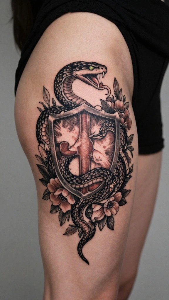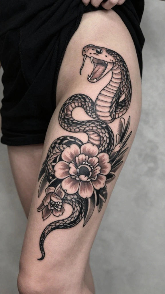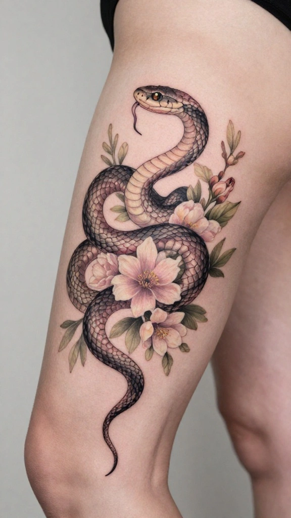 What thigh tattoo designs best balance elegance and fierceness for a feminine snake tattoo with floral elements?
