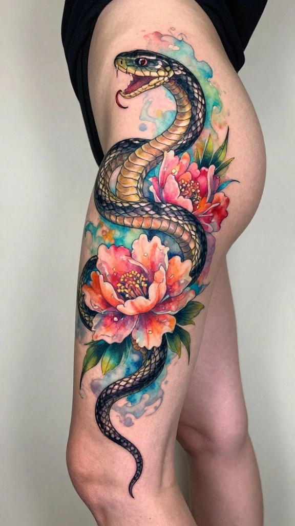 Roses and peonies bring romance and luxury, while cherry blossoms or lotuses convey resilience and grace. Ivy, eucalyptus, or winding leaves help frame the design and guide the snake’s movement along the thigh for a natural flow. Consider color strategies—bold, saturated florals for a dramatic look or soft watercolor florals for a lighter, more elegant tattoo ideas vibe. This approach aligns with current body art trends and keeps the design versatile for different outfits.