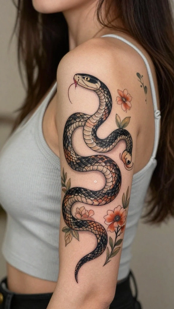 Decide if you want a colorful tattoo or a classic black and grey design. Color can bring your snake tattoo to life, especially when combined with floral elements. However, black and grey tattoos often have a timeless quality and can be easier to maintain. Consider how each option aligns with your personal style and skin tone.