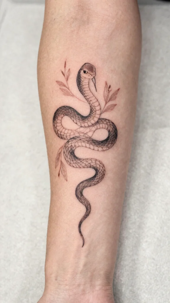 Integrating natural elements like leaves or flowers with a minimalist snake tattoo enhances its beauty and significance. A snake intertwined with delicate foliage symbolizes harmony with nature and transformation, providing a refreshing take on traditional imagery.