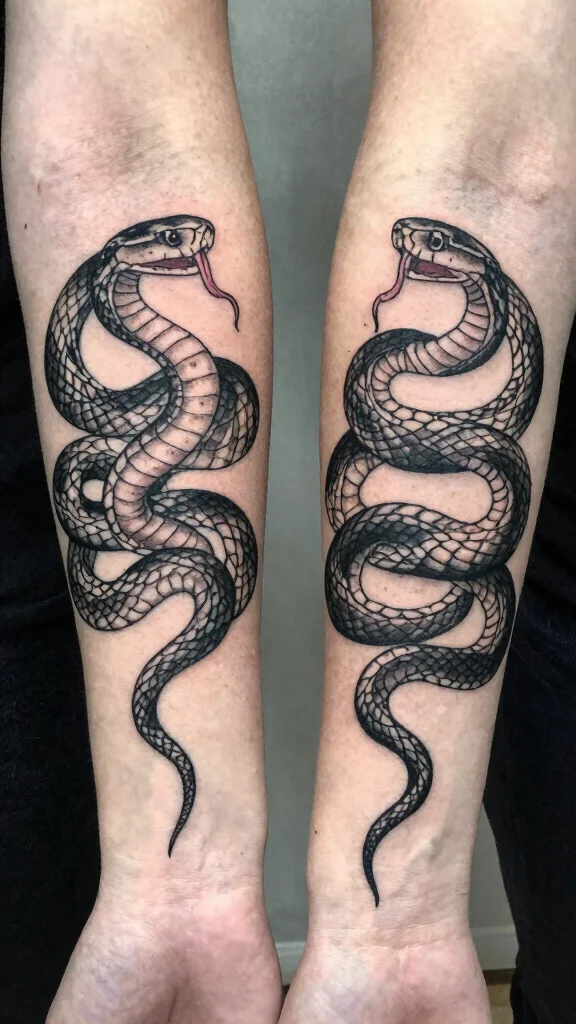 Matching snake tattoos symbolize a bond between two individuals, whether they are friends, siblings, or partners. This design choice celebrates connection through shared art, whether you opt for identical tattoos or complementary designs.