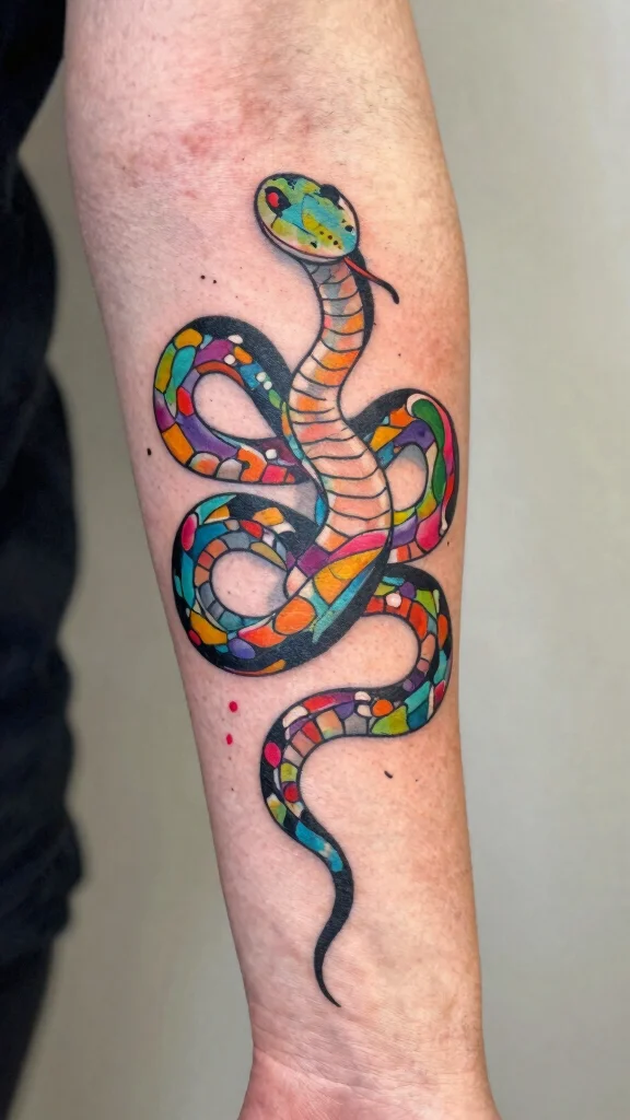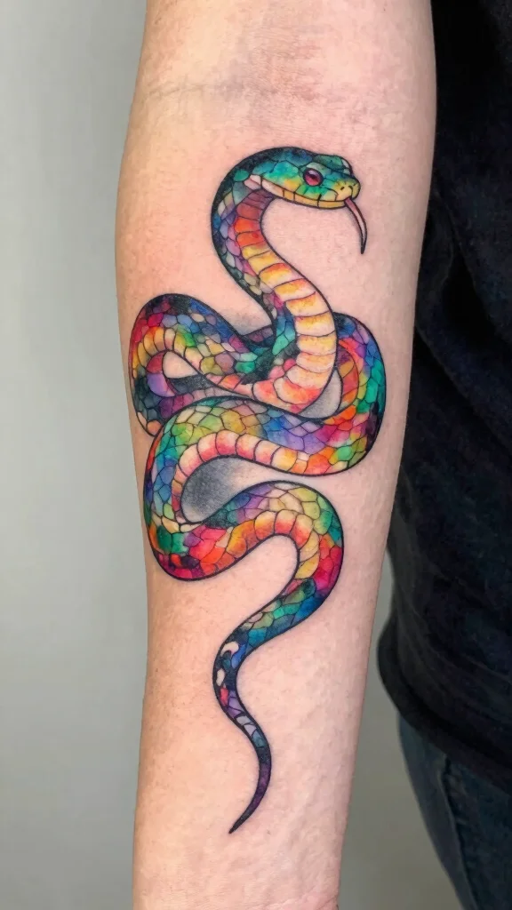 Watercolor tattoos are vibrant, fluid, and artistic, resembling a painted masterpiece rather than traditional ink. A watercolor snake tattoo can bring a dynamic flair to your forearm, blending colors that flow together beautifully.