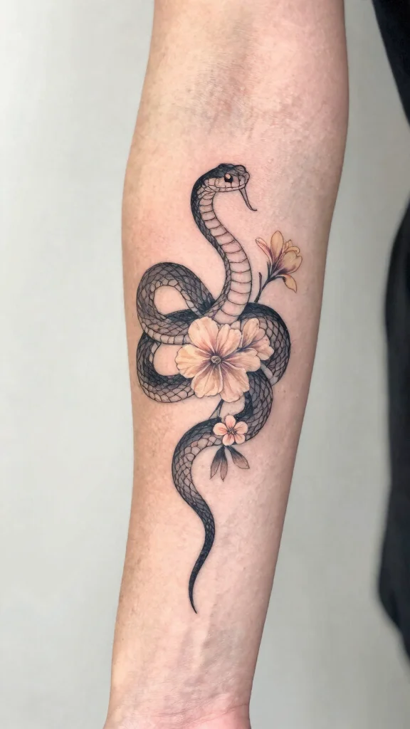This design can be tailored with various flower types, each carrying unique significance, allowing for a personal touch. The flowers soften the snake’s image, adding a gentle quality to the visual narrative.