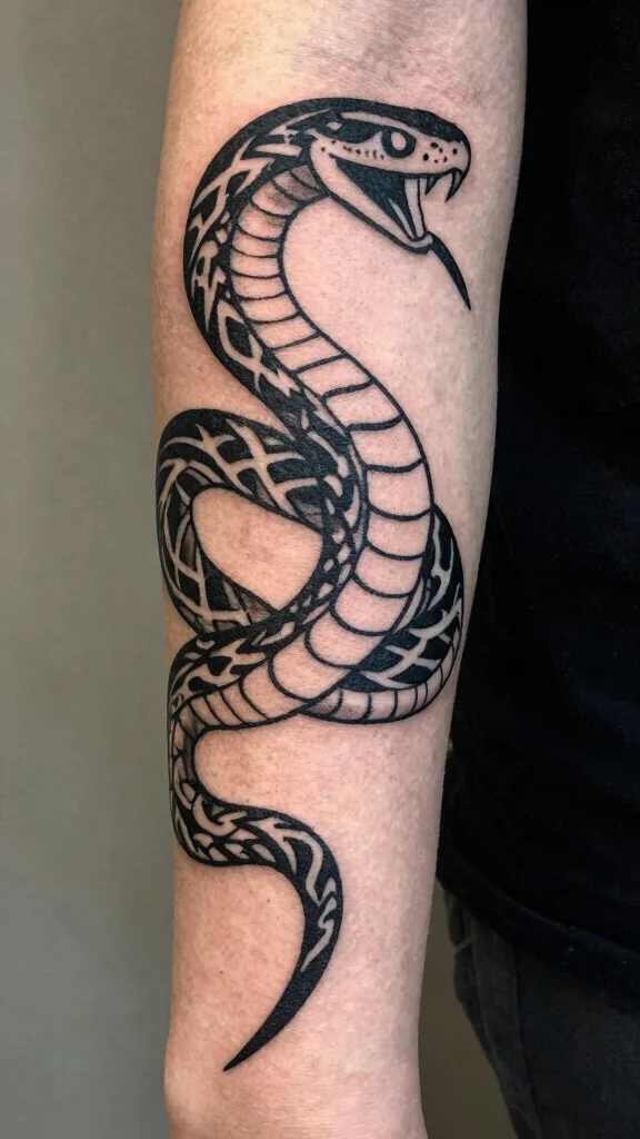 Tribal snake tattoos draw from rich cultural histories, featuring bold black ink and sharp lines. These designs symbolize strength, protection, and resilience, and they follow the contours of the forearm beautifully. The geometric patterns create a visually captivating piece that resonates with cultural significance.