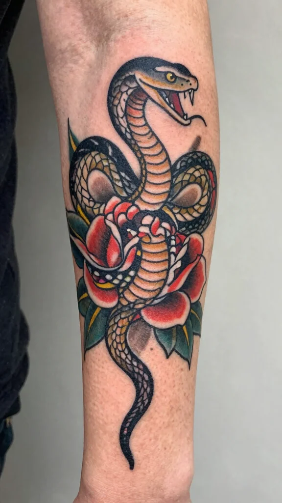 Classic imagery often includes roses, daggers, or banners that add layers of meaning to the snake design. Vintage tattoos symbolize resilience, danger, or transformation, depending on the elements included.