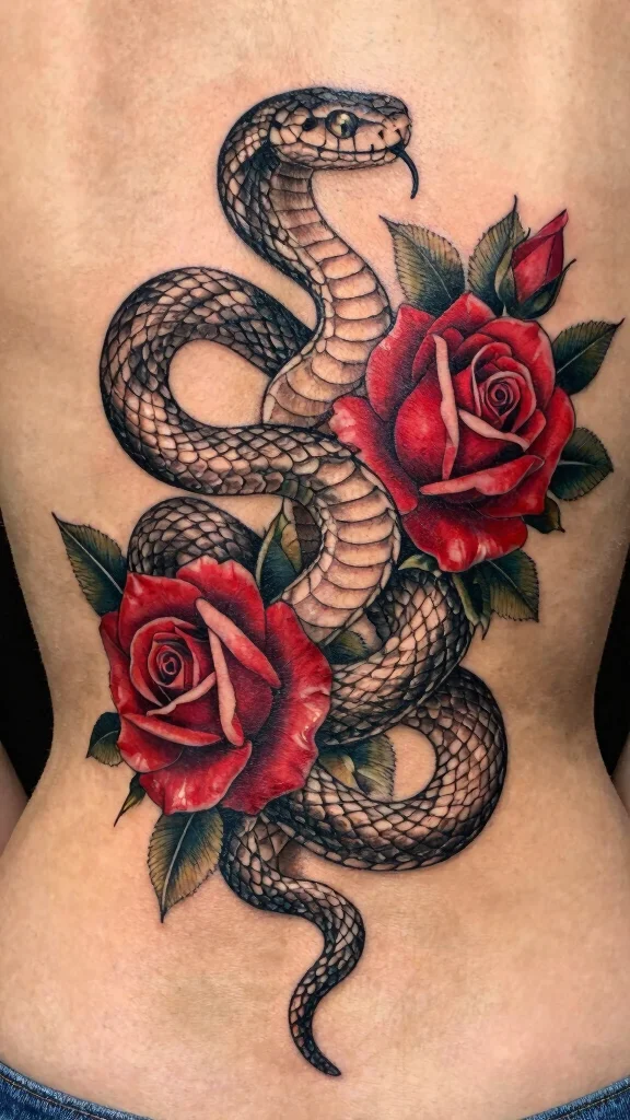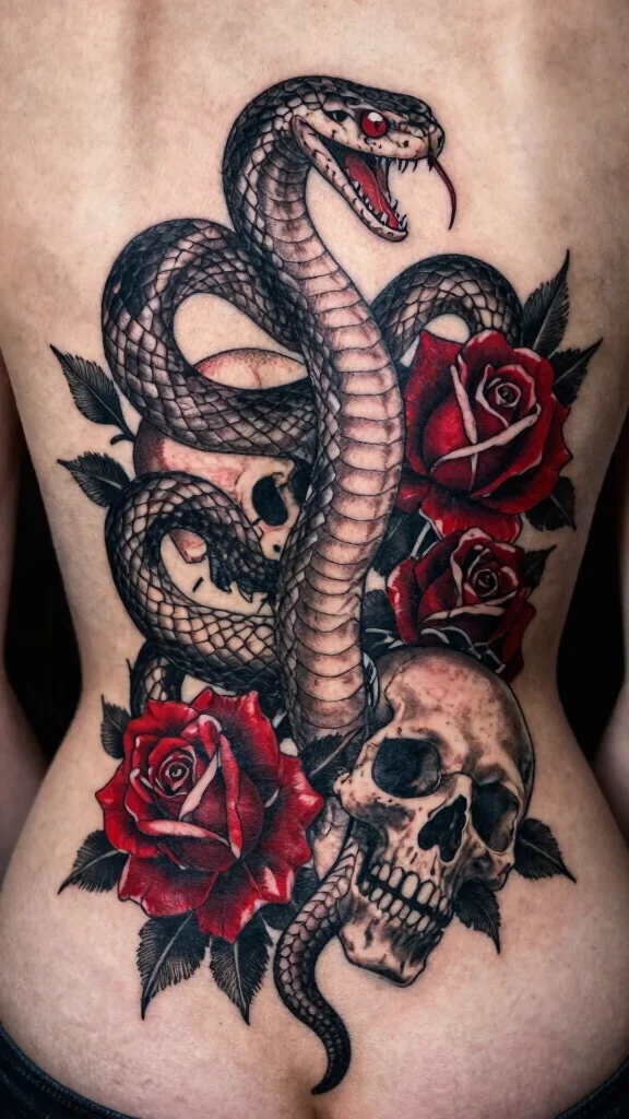 Imagine a snake gracefully curling down your spine, symbolizing your journey and evolution. This design not only captivates but also empowers, merging strength with beauty. The addition of vibrant red roses enhances the visual impact, creating a stunning contrast between the fierce serpent and the soft petals.