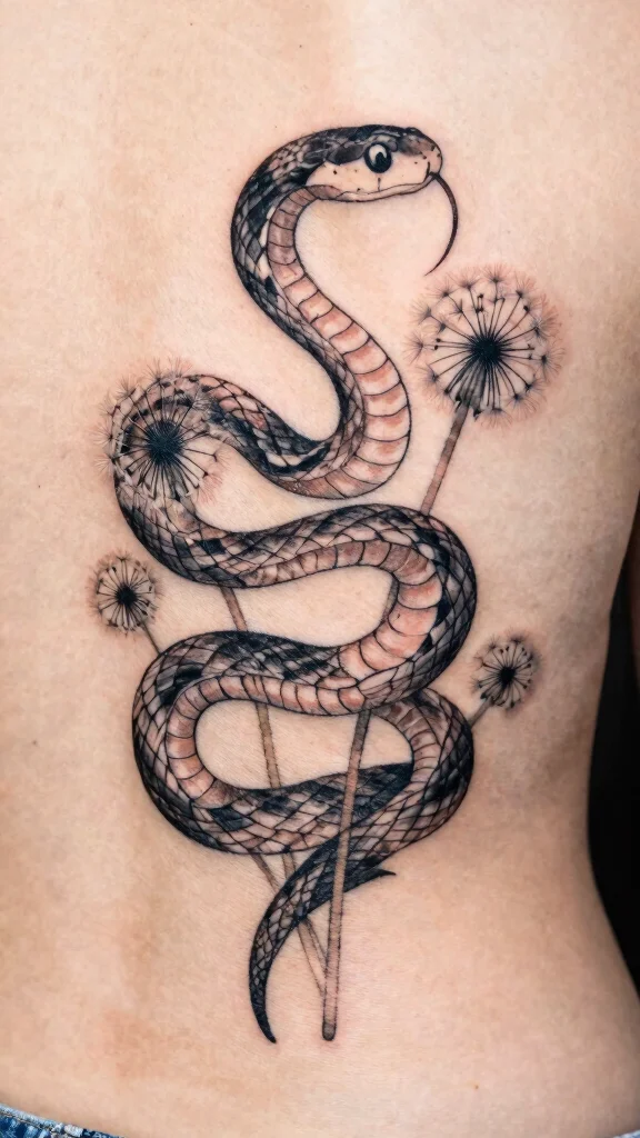 Dandelions, symbolizing wishes and hopes, make a meaningful addition to a snake tattoo. This design can showcase a snake intertwining with delicate dandelion puffs, representing freedom and aspiration. Using soft colors for the dandelions creates a gentle contrast against the snake’s bold presence.