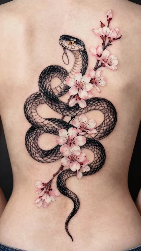 Cherry blossoms represent beauty and the fleeting nature of life, making them a delicate counterpart to the enduring snake. This design merges the transient beauty of the blossoms with the snake’s strength, creating a stunning visual. Soft pinks and whites for the blossoms against a sleek black snake create a striking contrast.
