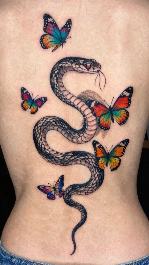Butterflies symbolize transformation and freedom, making them the perfect accompaniment to a snake tattoo. This design can depict a snake and butterflies dancing together, representing life’s changes and the beauty that comes with them. Vibrant colors for the butterflies enhance the overall visual impact, creating a lively and meaningful design.