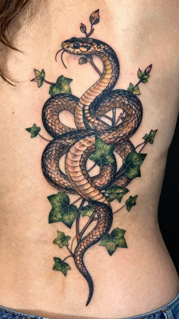 Ivy and vines symbolize growth and connection, making them a beautiful addition to a snake tattoo. This design represents the intertwining of personal growth and strength, emphasizing resilience and beauty. Using green shades for the ivy alongside soft colors for the snake creates a natural and earthy aesthetic.