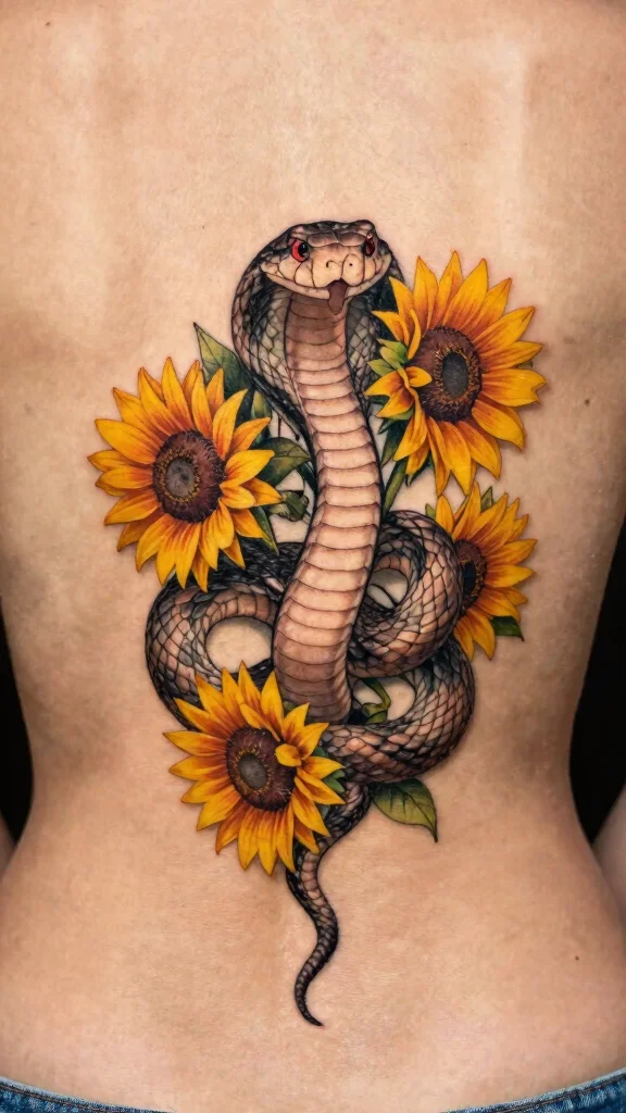 Sunflowers, known for their vibrant and cheerful nature, pair beautifully with a snake tattoo. This design symbolizes warmth, positivity, and strength, making it a heartening choice. Bright yellows for the sunflowers against a sleek snake create a striking visual that radiates energy and meaning.