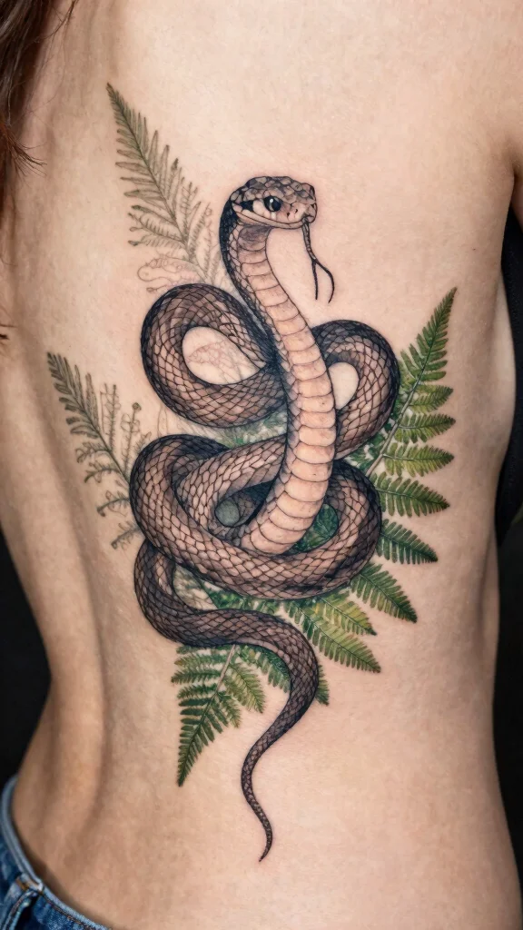 Ferns add a natural, earthy touch to a snake tattoo, highlighting organic beauty and growth. This combination creates a serene and elegant design, perfect for women who appreciate the tranquility of nature. Using shades of green for the ferns enhances the snake’s presence, resulting in a harmonious composition.