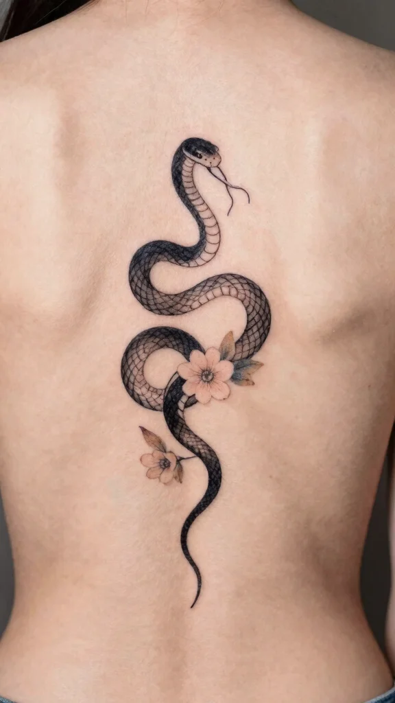 Spine tattoos for women snake with floral accents come in several elegant flavors. Popular designs include a slender serpent that winds along the spine, paired with delicate floral accents like roses, peonies, or cherry blossoms. You can opt for a minimalist single-line snake, or a more intricate coil where the flowers weave around the body and the scales fade into soft shading. This style centers on spine tattoo inspiration and graceful linework that stays refined at any size. When planning, consider your natural back curve and choose a layout that keeps the look elegant rather than busy.