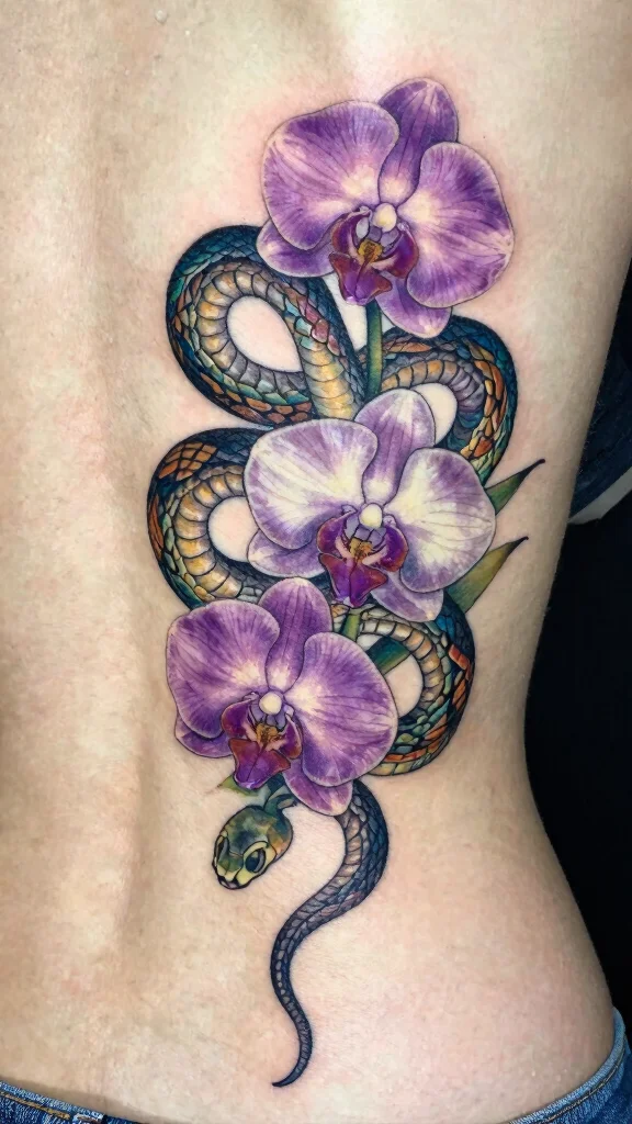Orchids add a touch of exotic beauty to a snake tattoo, making it a fabulous choice. The vibrant colors and intricate details create a stunning visual harmony, showcasing both the grace of the snake and the elegance of the orchids. This design not only looks fantastic but also embodies deep meanings of strength and resilience.