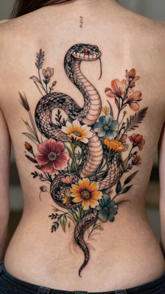 Customization is a big part of getting a feminine spine tattoo ideas that truly fits your body. You can adjust the length, thickness of the line, and how the floral details wrap around your spine. Color versus black-and-gray can change the overall vibe from elegant snake tattoos to bold statement pieces, while the floral accents can range from delicate cherry blossoms to lush peonies. Work with an artist to align the design with your torso curves for a harmonious look—this is where spine tattoo inspiration really shines.
