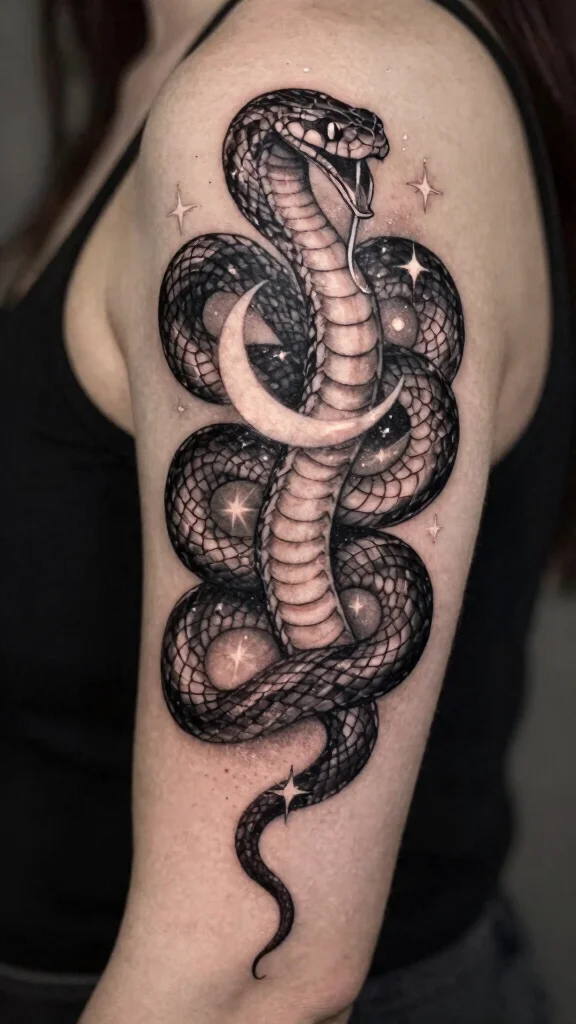 Imagine a mystical snake design combined with celestial elements like stars and moons. This tattoo not only captivates the eye but also symbolizes your connection to the universe. Using dark colors for the snake with glowing celestial accents creates a striking visual contrast.
