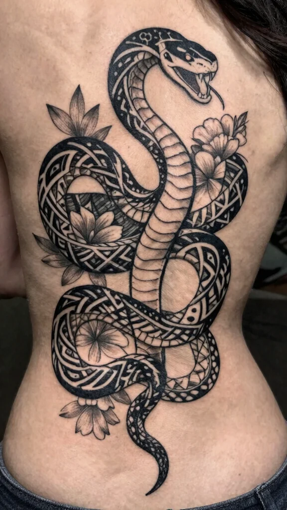 If tribal art resonates with you, an intricate tribal snake tattoo could be your perfect fit. These designs feature bold lines and geometric patterns that create a striking visual impact. Adding floral elements can soften the look, blending styles beautifully.