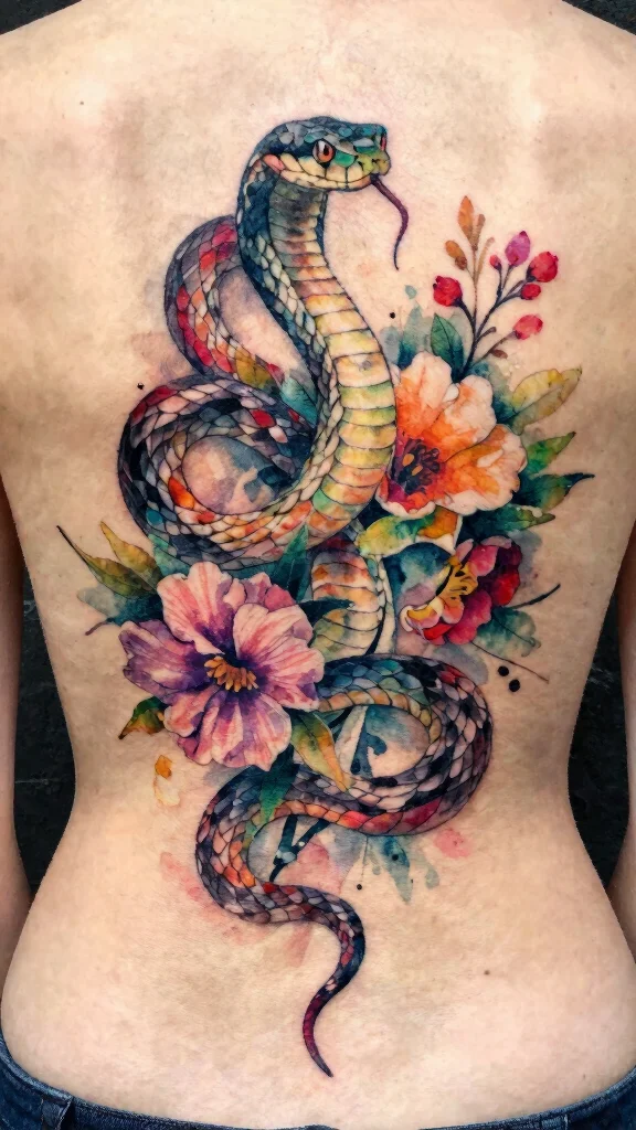 Watercolor tattoos add a unique artistic flair, transforming a snake design into a flowing masterpiece. This style employs splashes of color that resemble a painting, creating a dreamy and ethereal effect. Combining the snake with watercolor florals can produce a breathtaking composition that looks alive.