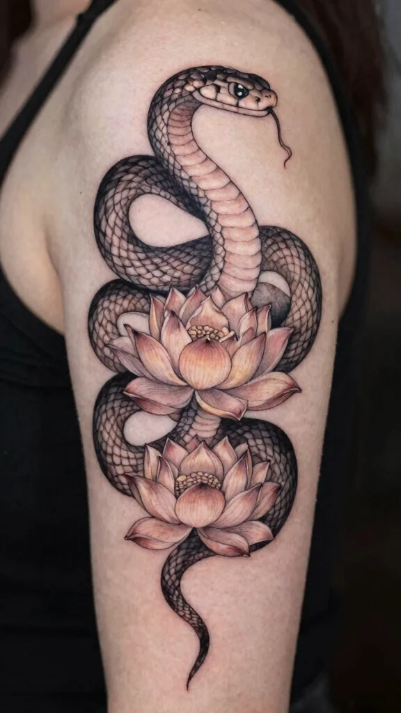 Choosing soft colors and gentle line work will enhance its overall elegance, making it a sophisticated piece. Consider how the lotus can enhance the snake’s beauty in your tattoo.