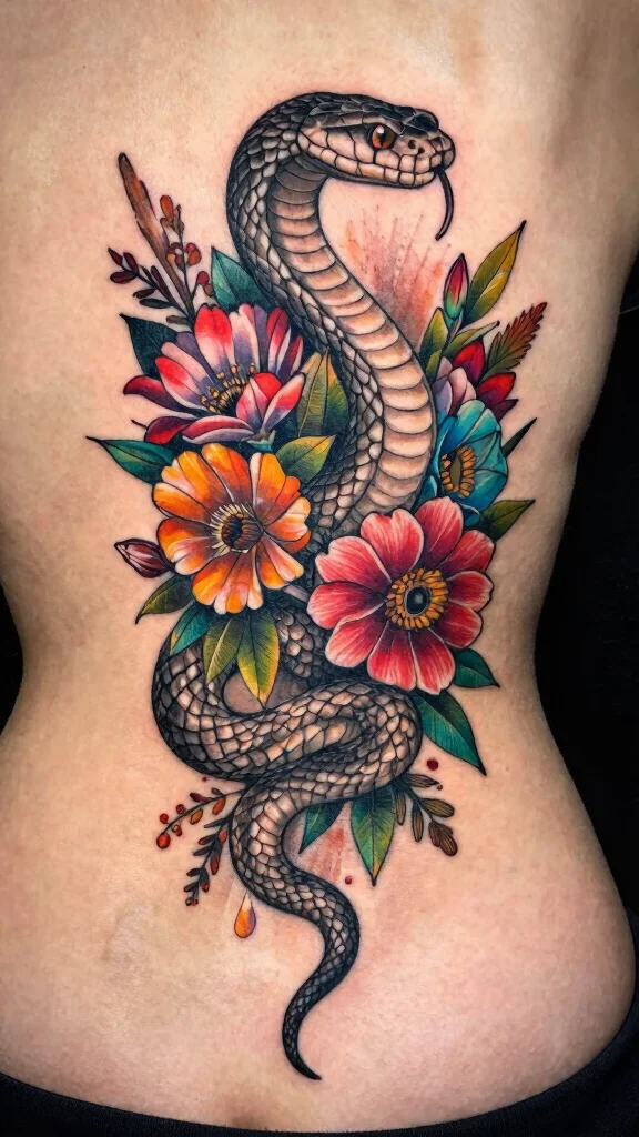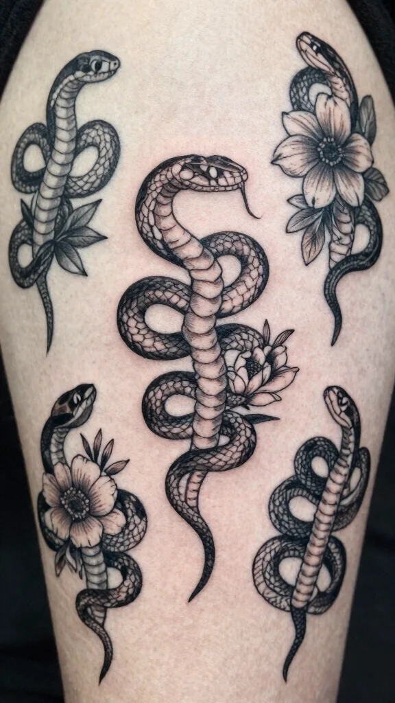 Picture a snake emerging from a bed of blooming flowers, creating a powerful and dynamic tattoo. This design symbolizes rebirth and renewal, suggesting that beauty can arise from struggle. Opting for vibrant florals surrounding a well-defined snake can give this tattoo a lively essence.