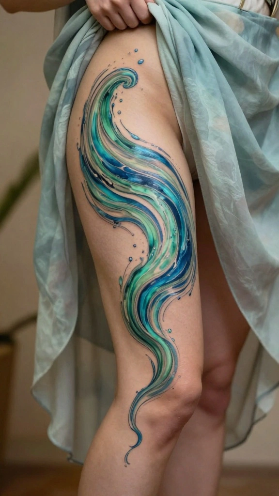 Water symbolizes life and emotions, making it a captivating choice for abstract tattoos. Swirling water patterns evoke feelings of tranquility and adaptability, with shades of blue and green adding a calming touch. Imagine a visual representation that flows beautifully across your thigh, inviting others to explore its depths.