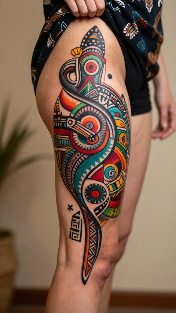 Cultural motifs can add a unique flair to abstract thigh tattoos, incorporating symbols that reflect personal heritage. When blended with abstract elements, these designs become visually stunning and meaningful. Embracing your cultural background can deepen the connection to your tattoo.