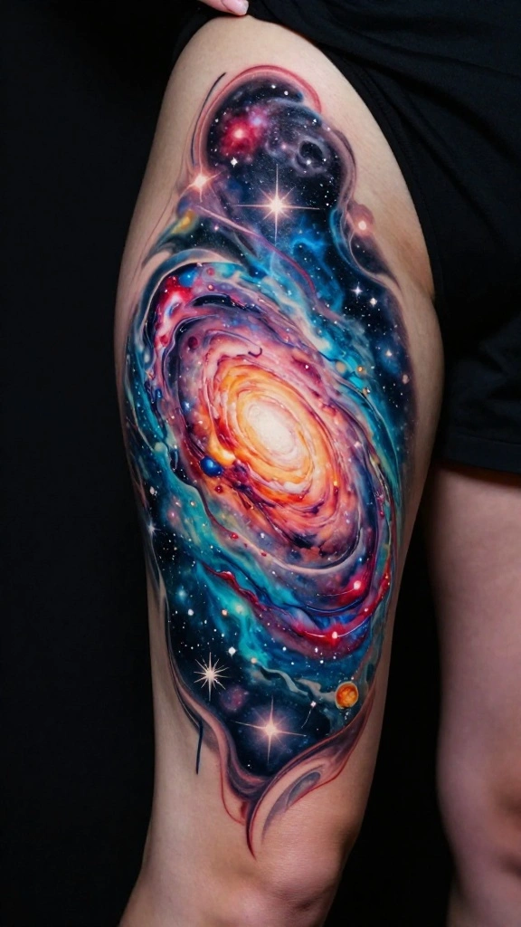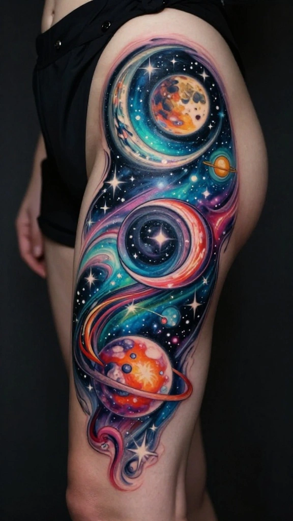 Fun fact: 68% of clients pick cosmic dreamscape ideas for thigh tattoos abstract designs to tell a personal story in color. Blend vibrant hues for a dreamy galaxy effect, then add a star or planet that marks your journey.