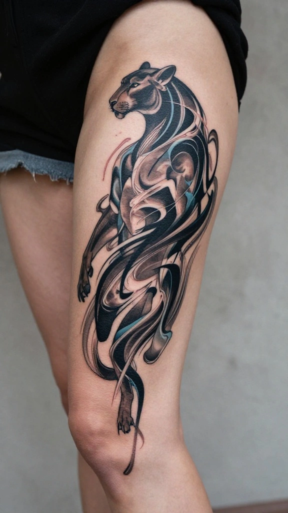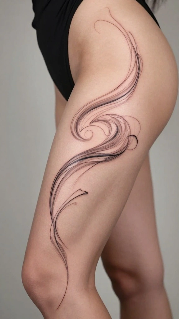 Flowing abstract lines in thigh tattoos abstract designs create movement like wind on the skin—free and expressive. To maximize impact, vary line thickness and add color gradients that follow your body’s curves for a personalized, bold look.