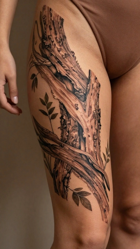 Botanical tattoos blend nature and art, transforming your thigh into a canvas of vibrant flora. Picture intricate leaves and flowers intertwined in an abstract design, symbolizing growth and beauty. This style connects you to nature in a stunning way, making a personal statement.