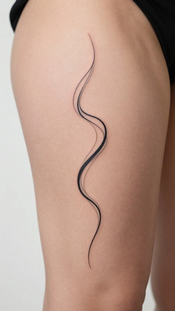 Minimalist line art proves less is more for thigh tattoos blackwork—try a simple line that follows your leg’s curve and lets subtle shapes tell your story. When a simple line follows your leg’s curve, it feels like art grown with you—personal, effortless, and unmistakably yours.