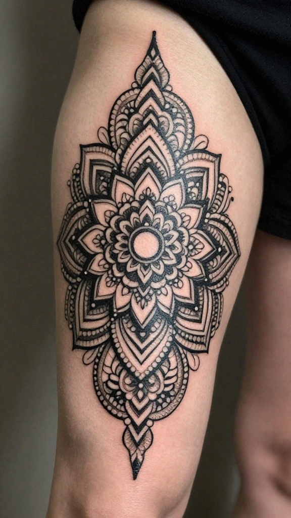 Mandala designs wrap the thigh like living art, proving thigh tattoos blackwork can be bold and spiritual. Keep the lines tight and circular to create striking contrast that ages gracefully. Pro tip: start with a strong center and let the pattern breathe.