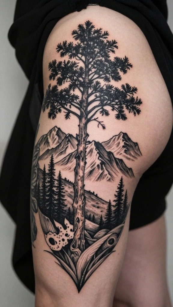 Nature-inspired thigh tattoos beautifully embody a love for the great outdoors. From trees to mountains and animals, these designs often carry personal meaning. The bold blackwork allows intricate details to stand out against your skin, showcasing the beauty of nature.