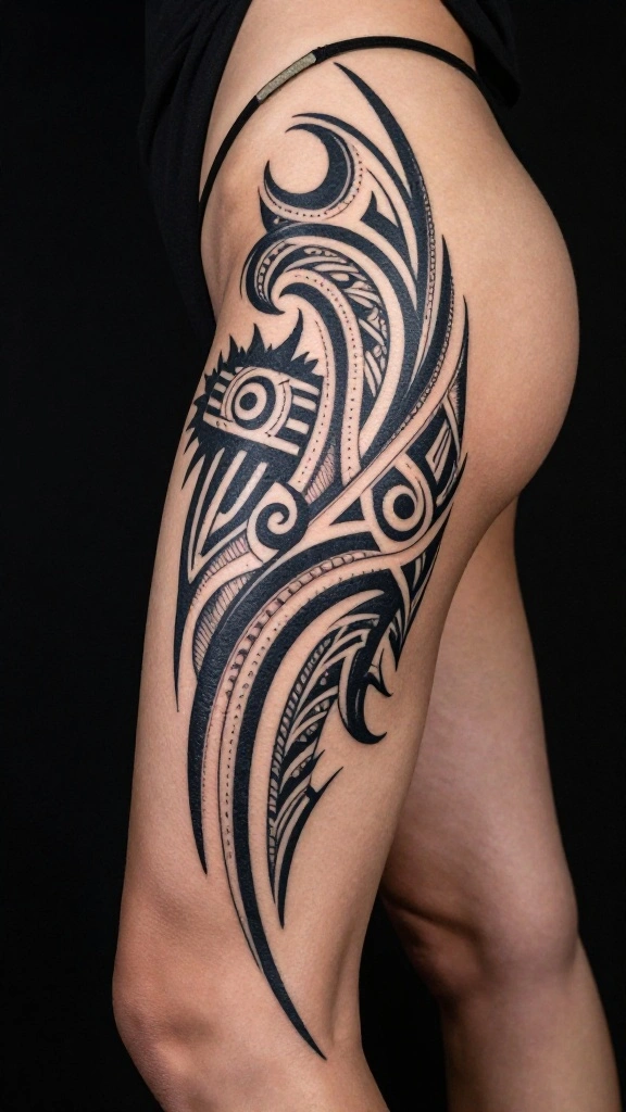 Tribal tattoos are steeped in history and symbolism, showcasing bold lines and intricate patterns. Thigh tattoos inspired by tribal art create powerful statements while honoring the heritage they represent. The blackwork enhances the design’s visual impact, allowing every curve to stand out sharply.